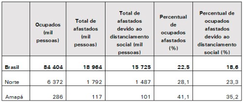 Entre os 286 mil trabalhadores do Amapá, 117 mil (ou 41,1%) estavam afastados do trabalho que tinham na semana de referência e 101 mil (ou 35,2%) estavam afastados devido ao distanciamento social. O Amapá apresentou o maior percentual (35,2%) de pessoas afastadas do trabalho devido ao distanciamento social, enquanto Rondônia foi a Unidade da Federação menos afetada (8,0%).