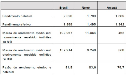 Em maio, a PNAD COVID19 constatou que 41,5% da população ocupada (ou 70 mil pessoas) trabalharam menos do que a sua jornada habitual, enquanto cerca de 8 mil pessoas trabalharam acima da média habitual. A média semanal de horas efetivamente trabalhadas (17,9h) no Amapá ficou abaixo da média habitual (37,5h). Efeito similar foi observado no rendimento efetivo dos trabalhadores (R$ 1.342), que ficou 20,4% abaixo do rendimento habitual (R$ 1.685). Em maio, 61,8% dos domicílios do Amapá receberam algum auxílio monetário governamental relacionado à pandemia, no valor médio de R$ 1.028. Em maio, 226 mil pessoas apresentaram sintomas associados à COVID-19. Com isso, o Amapá mostrou o maior percentual (26,6%) de pessoas nessa condição.