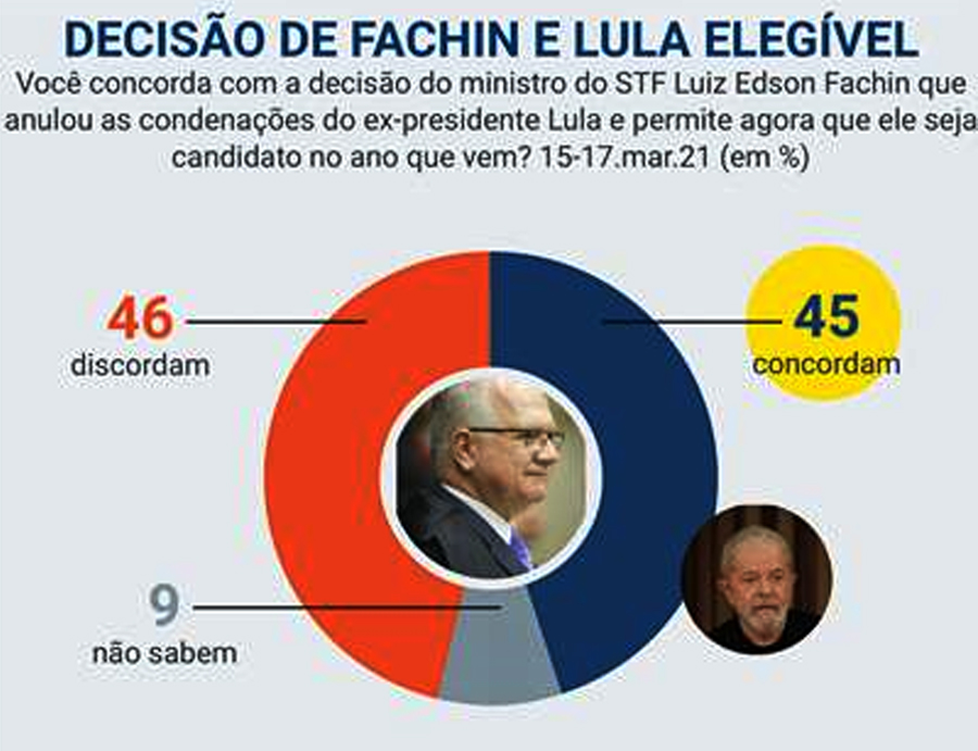 MAIORIA CONSIDERA LULA CULPADO E VÊ QUE FACHIN AGIU MAL, DIZ DATAFOLHAPara 57% da população, a condenação do ex-presidente Luiz Inácio Lula da Silva no caso do tríplex no Guarujá foi justa. Outros 51% consideram que o ministro do Supremo Tribunal Federal (STF), Edson Fachin, agiu mal ao decidir anular as decisões contra o petista. É o que revela a pesquisa Datalha, divulgada na segunda-feira (22), que ouviu 2.023 pessoas entre os dias 15 e 16 março. A margem de erro é de dois pontos, para mais ou menos. Para 38% dos ouvidos pelo Datafolha, a decisão foi injusta, outros 5% não souberam opinar. Lula foi condenado pelo então juiz Sergio Moro há 9 anos e 6 meses de prisão no caso do tríplex, no âmbito da Operação Lava Jato. A pena foi aumentada pela 12 anos e um mês na segunda instância e, depois, reduzida a 8 anos e 10 meses no Superior Tribunal de Justiça (STJ). Lula foi preso em abril de 2018 e foi solto em novembro de 2019 após mudança de entendimento do STF sobre a possibilidade de prisão após condenação em segunda instância. Ainda no ínicio deste mês, Fachin anulou as condenações de Lula na Lava Jato e mudou seu entendimento acerca das competências da vara de Curitiba, que era comandada pelo então juiz Moro. Para 51% dos ouvidos, Fachin agiu mal ao anular as condenações; 42% acreditam que o ministro acertou e outros 6% não souberam responder. A decisão de Fachin ainda deve ser apreciada pelo plenário do Supremo. Com as anulações, Lula voltou a se tornar elegível, de acordo com a Lei da Ficha Limpa. Quando questionados sobre a possibilidade do ex-presidente concorrer às eleições em 2022, 51% não querem que ele dispute o pleito, enquanto 47% aprovam a candidatura.