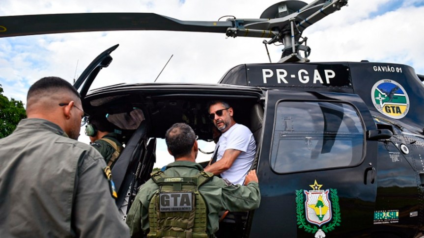 Clécio embarca em helicóptero do Grupo Tático Aéreo para acompanhar os serviços de reestrutura da linha de fornecimento de energia— Fotos: SECOM/GEA