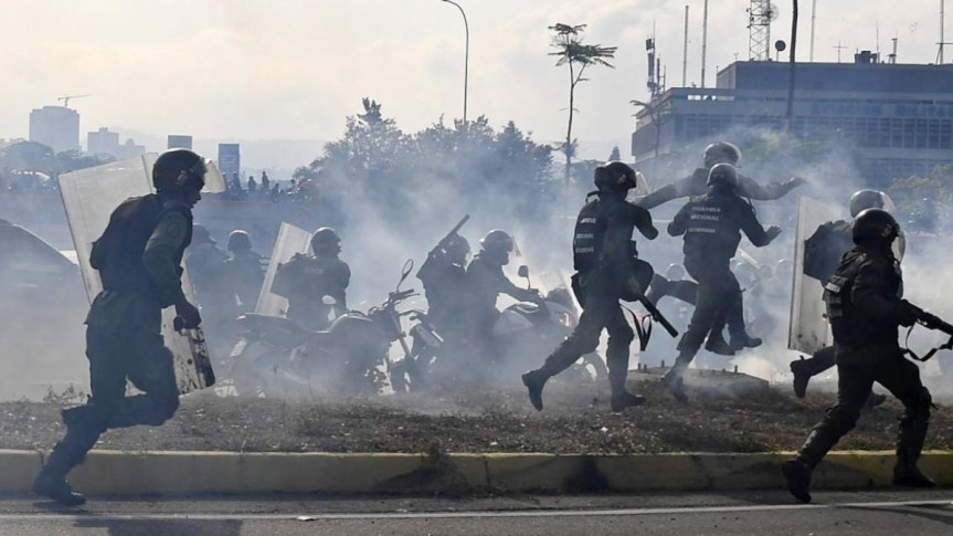 Membros da Guarda Nacional Bolivariana perseguem opositores do “führer” venezuelano sob uma nuvem de gás lacrimogêneo — Foto: Yuri Cortez / AFP