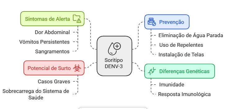 O infectologista Henrique Lacerda afirma que os diferentes sorotipos têm variações genéticas, e embora todos causem sintomas semelhantes, o DENV-3 tem maior potencial para surtos e casos mais graves, especialmente em pessoas que já tiveram outras infecções. A falta de imunidade ao DENV-3 pode resultar em formas mais severas da doença. Isso é preocupante porque pessoas sem contato anterior com esse sorotipo podem enfrentar sintomas graves.