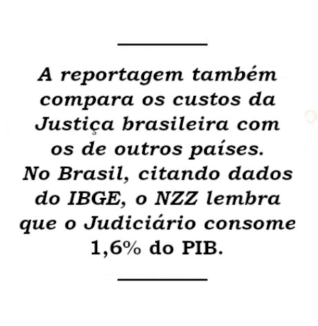 O NZZ também critica os privilégios da elite jurídica no Brasil, que incluem férias excessivas e a prática de “vender” férias. Além disso, aponta que o Judiciário brasileiro consome 1,6% do PIB, muito mais do que a Suíça, que tem apenas 0,28%.