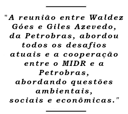 Waldez Góes, ministro da Integração e do Desenvolvimento Regional, se encontrou com Giles Azevedo, representante da Petrobras, para tratar da exploração de petróleo e gás natural na Margem Equatorial, com ênfase no desenvolvimento da região. A reunião teve como objetivo discutir os desafios contemporâneos e as possibilidades de cooperação entre o MIDR e a Petrobras, abordando questões ambientais, sociais e econômicas, bem como a formação de indivíduos para atuar na cadeia produtiva de energia.