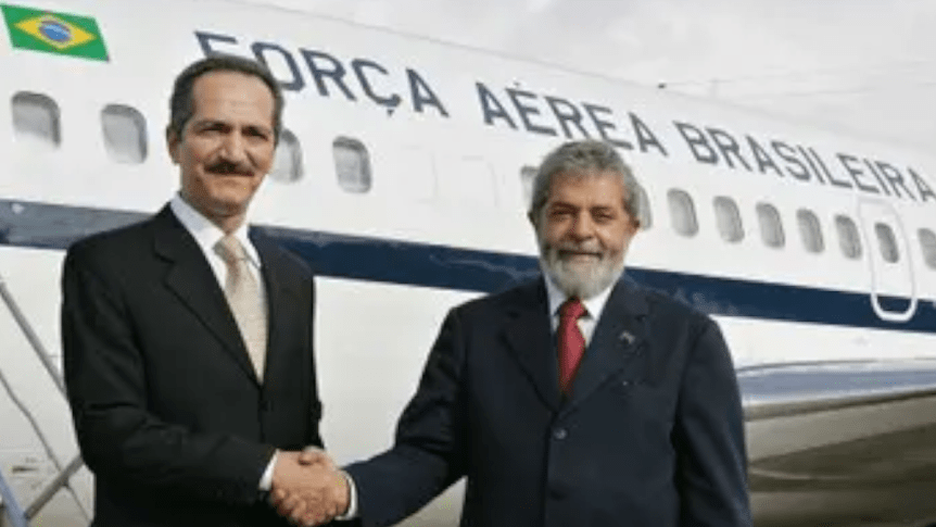 EX-BONS COMPANHEIROS — Aldo Rebelo e Lula da Silva posam ao lado do avião oficial do governo brasileiro