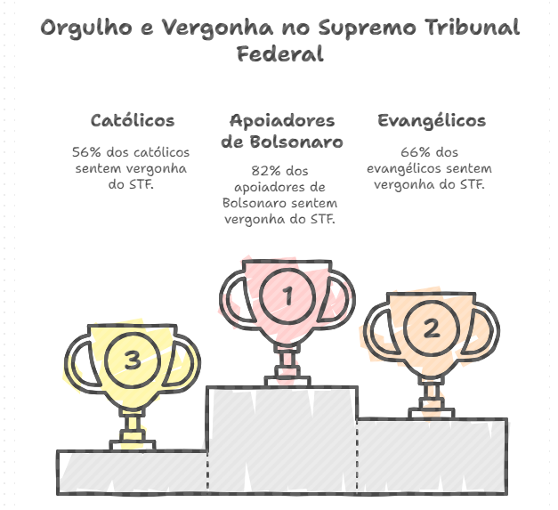 A preferência religiosa dos entrevistados também indica diferenças. Católicos têm 33% de orgulho dos magistrados, enquanto os envergonhados são 56%. No grupo dos evangélicos, 66% dizem ter vergonha dos ministros e 22% sentem orgulho.