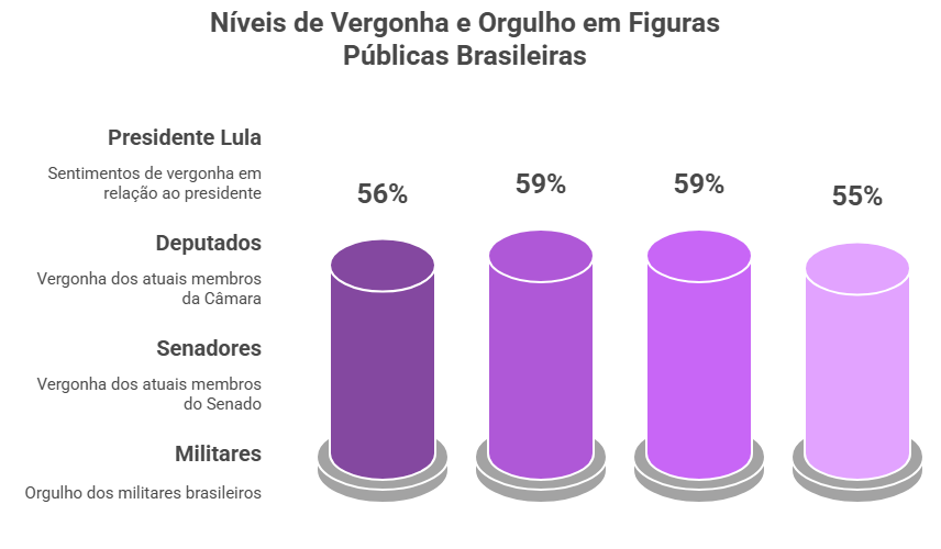 Os índices de rejeição ao STF são similares aos dos outros Poderes. 56% dos entrevistados declararam sentir vergonha do presidente Lula, 59% disseram ter vergonha dos deputados atuais e 59% sentem vergonha dos senadores. A pesquisa ainda apontou que 55% dos brasileiros tem mais orgulho do que vergonha dos militares.