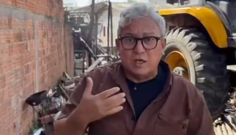 Na gravação, realizada em meio aos escombros e com o ruído de um trator ao fundo removendo entulhos, o secretário apresentava uma aparência visivelmente desordenada, com o cabelo bagunçado e um tom de voz que beirava o desespero.