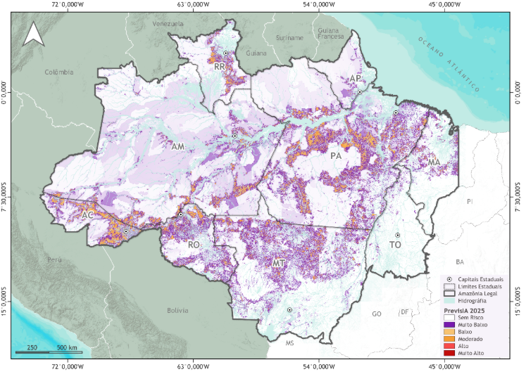 Mapa mostra as áreas sob risco alto, muito alto, moderado, baixo e muito baixo de desmatamento conforme a PrevisIA para o calendário de 2025, que vai de agosto de 2024 a julho do ano seguinte