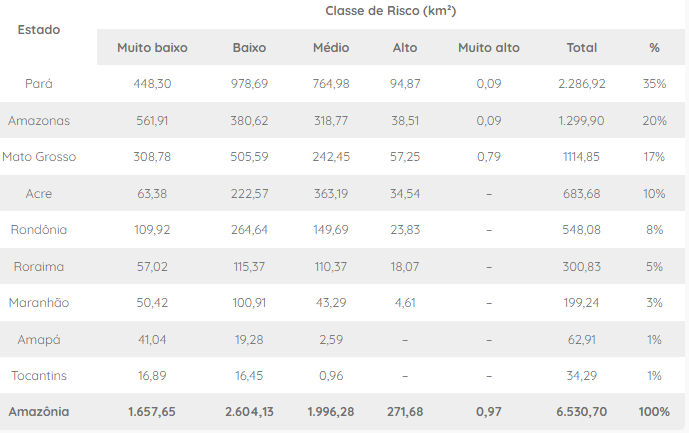 Os estados com maior risco de desmatamento são Pará (35%), Amazonas (20%) e Mato Grosso (17%), que juntos concentram 72% do território ameaçado. A PrevisIA também identificou um aumento nas áreas em risco em cinco estados para o próximo ano, enquanto em três estados as áreas previstas para 2025 são menores do que as desmatadas em 2024.
