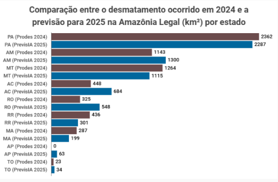 Para 2024, a PrevisIA apontou 8. 959 km² sob ameaça, sendo 5. 207 km² com risco muito alto, alto ou moderado. Para 2025, a previsão é de 6. 531 km² sob ameaça, dos quais 2. 269 km² (35%) estão em risco muito alto, alto ou moderado, indicando áreas prioritárias para ações de prevenção. Os outros 4. 262 km² (65%) têm risco baixo ou muito baixo de desmatamento. O pesquisador Carlos Souza Jr. destacou que proteger essas áreas críticas pode ajudar a reduzir o desmatamento e melhorar as metas de emissões de gases de efeito estufa.