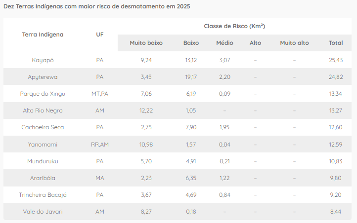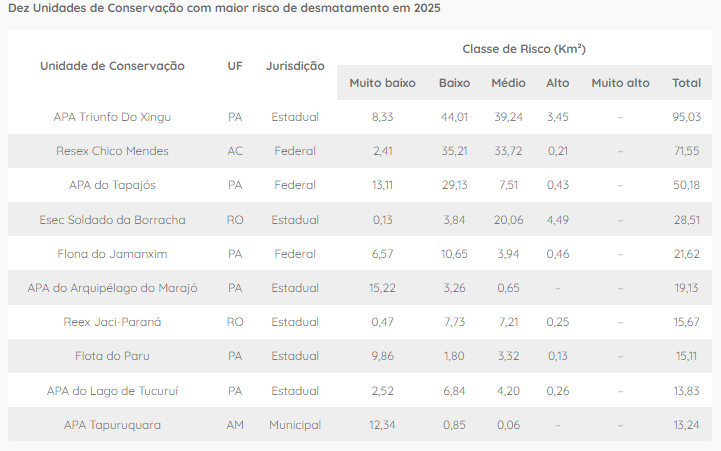 A Terra Indígena Kayapó é a mais ameaçada, com uma área equivalente a 2. 500 campos de futebol sob risco. Já a Área de Proteção Ambiental Triunfo do Xingu continua a ser a mais ameaçada entre as unidades de conservação. A PrevisIA usa dados históricos de desmatamento para projeções, mas alertas foram feitos sobre a possibilidade de a previsão ser conservadora devido ao aumento recente de desmatamento. A PrevisIA, lançada em 2021, é uma ferramenta inovadora que analisa várias variáveis para indicar áreas em risco de desmatamento.