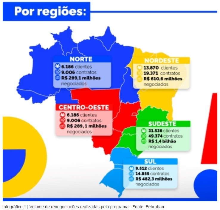 REGIÕES – A Região Sudeste concentra quase metade das movimentações relativas ao programa. Juntos, São Paulo, Minas Gerais, Rio de Janeiro e Espírito Santo concentram 31.536 empresas, 49 mil contratos e R$ 1,4 bilhão em valores renegociados. Na sequência aparece o Nordeste, com 13,8 mil empresas, 19,3 mil contratos e R$ 610 milhões em valores, seguido por Sul (9,5 mil empresas), Centro-Oeste (6,1 mil) e Norte (4,2 mil).