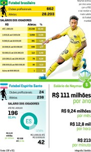 CENÁRIO DE PENÚRIA É ROTINA ENTRE OS CLUBES DE MENOR RELEVÂNCIA Num comparativo a esse cenário de penúria para a maioria dos jogadores que atua no Brasil, Neymar é um objetivo quase inalcançável para quem corre atrás da bola. Principal nome brasileiro em atividade no planeta, o atacante revelado pelo Santos embolsa R$ 405 milhões ao ano. Se for considerado os rendimentos com publicidade e patrocínio, as cifras alcançam R$ 501 milhões. O estudo indica que cerca de R$ 52 bilhões são movimentados no futebol aqui no Brasil. De acordo com a pesquisa, 80% do valor total dos salários está concentrada em apenas 7% dos atletas. Para Walter Dal Zotto, presidente do Juventude, a chave para tentar iniciar uma mudança passa, em primeiro lugar, por uma reformulação estrutural no futebol brasileiro. Isso tem relação direta com um calendário que permita aos times estar em atividade o ano inteiro. "A minha ideia é estruturar e melhorar o calendário brasileiro. Ampliar o número de divisões. Teríamos de estruturar mais divisões no Campeonato Brasileiro porque existem clubes de camisa pesada na Série D que não conseguem subir", afirmou. O dirigente defende ainda que uma pequena reestruturação de recursos financeiros poderia dar mais condições para os clubes menores se manterem. "Tem muito dinheiro na Série A. Um porcentual mínimo desses recursos poderia ser canalizado para as Séries C e D e outras divisões. Assim, teríamos competições organizadas o ano inteiro para essas equipes. E com calendário já definido, elas poderiam investir mais, conseguir patrocinadores", comentou. Para Junior Chavare, gerente de futebol do Bahia, a melhora salarial dos jogadores que atuam em times mais modestos tem de estar diretamente ligada à estabilidade dos clubes. "Só com equipes competitivas e com a questão financeira em dia é que a remuneração dos atletas pode melhorar. Nas condições em que se trabalha atualmente, é difícil exigir algo a mais. Hoje o que deveria ser obrigação, pagar em dia, é muitas vezes uma exceção. Infelizmente a gente sabe que isso não acontece", comentou o dirigente.