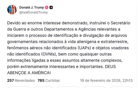 A geopolítica do Salão Oval acaba de ganhar um novo e inusitado campo de batalha: o espaço sideral — ou, pelo menos, o que os documentos ultrassecretos dizem sobre ele. Em um movimento que mistura estratégia de transparência, picuinha política e o eterno fascínio humano pelo desconhecido, o presidente Donald Trump anunciou na quinta-feira (19) uma diretriz que parece saída diretamente de um roteiro de ficção científica. Ele instruiu o Secretário da Guerra e diversas agências de inteligência a desclassificarem e divulgarem arquivos governamentais sobre vida extraterrestre, Fenômenos Aéreos Não Identificados (UAPs) e os clássicos OVNIs.