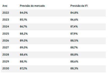 O mercado financeiro – segundo a mediana das expectativas compiladas no boletim Focus, do Banco Central – e a IFI projetam os seguintes patamares para a dívida bruta do setor público (em % do PIB) nos próximos anos: