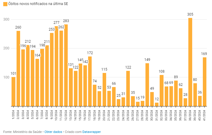 Também é possível observar que o número de óbitos notificados em 2024 apresentou variação ao longo do ano. O primeiro ponto mais alto aconteceu logo na segunda semana epidemiológica, com 260 mortes registradas.